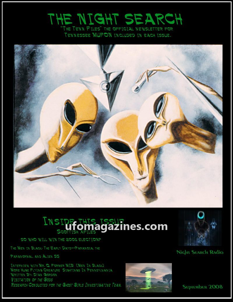 This issue of 'The Night Search' newsletter from September 2008 covers a range of paranormal and UFO-related topics. It includes an interview with a former 'Man in Black' (MIB) who