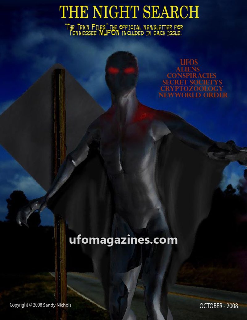 This issue of 'The Night Search' magazine delves into various paranormal and conspiratorial topics. It features articles on alien humanoids, the mystery of Mothman in Tennessee, an