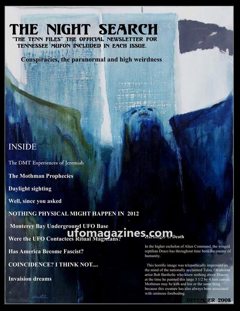 This issue of 'The Night Search' delves into various paranormal and conspiratorial topics. It includes personal accounts of DMT experiences and Mothman prophecies, alongside detail
