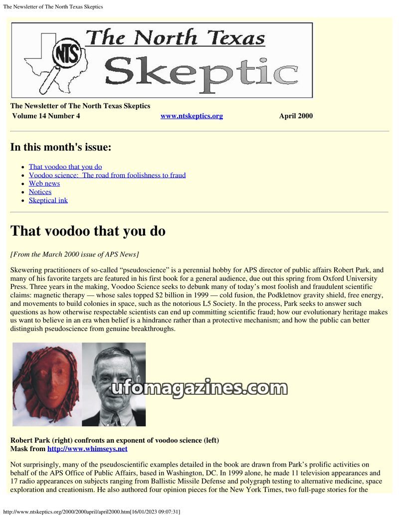 This issue of The North Texas Skeptics critiques various pseudoscientific claims and practices. It reviews Robert Park's book 'Voodoo Science,' which debunks topics like magnetic t