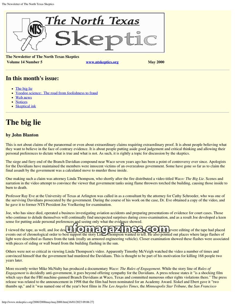This issue of The North Texas Skeptic critically examines the Waco siege, debunking claims made in the video 'Waco: The Big Lie' and Mike McNulty's documentary 'Waco: The Rules of