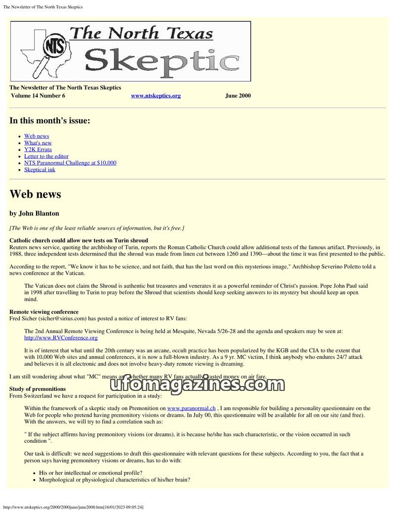 This issue of The North Texas Skeptic covers various skeptical topics including new web news, potential new tests for the Turin Shroud, a remote viewing conference, a study on prem