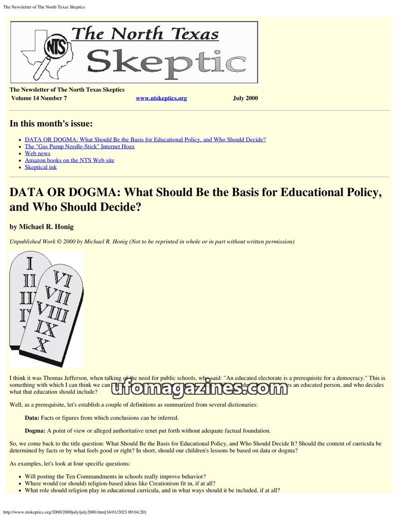 This issue of The North Texas Skeptic, dated July 2000, features a lead article by Michael R. Honig questioning whether educational policy should be based on data or dogma, and who