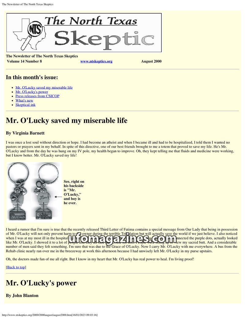 This issue of The North Texas Skeptic includes personal accounts of the perceived power of a totem named 'Mr. O'Lucky'. It also features critical analyses of Thought Field Therapy