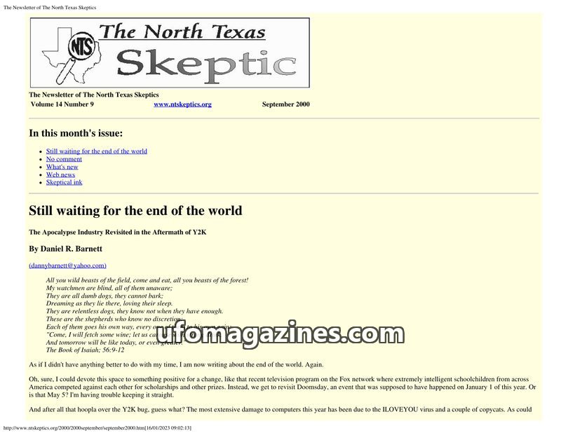 This issue of The North Texas Skeptic, dated September 2000, focuses on the aftermath of the Y2K scare and the continued prevalence of doomsday prophecies and cult activities. Dani