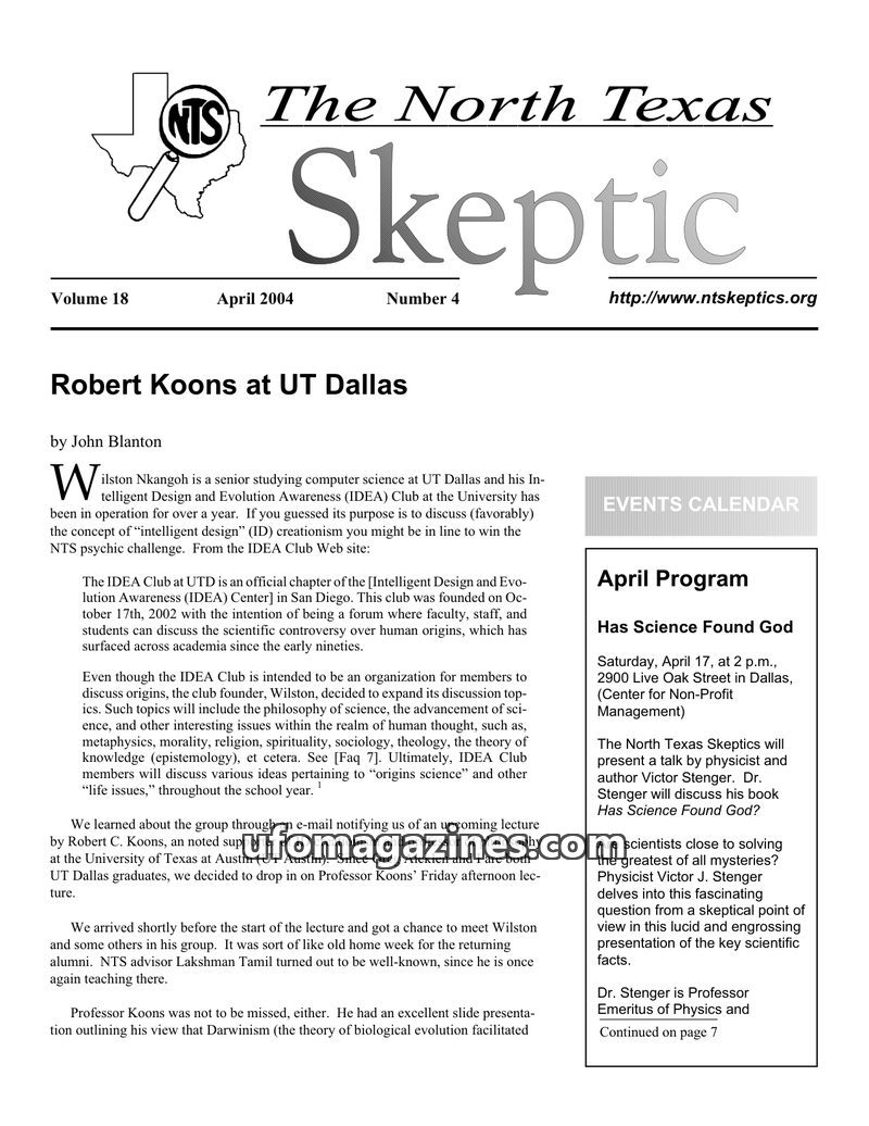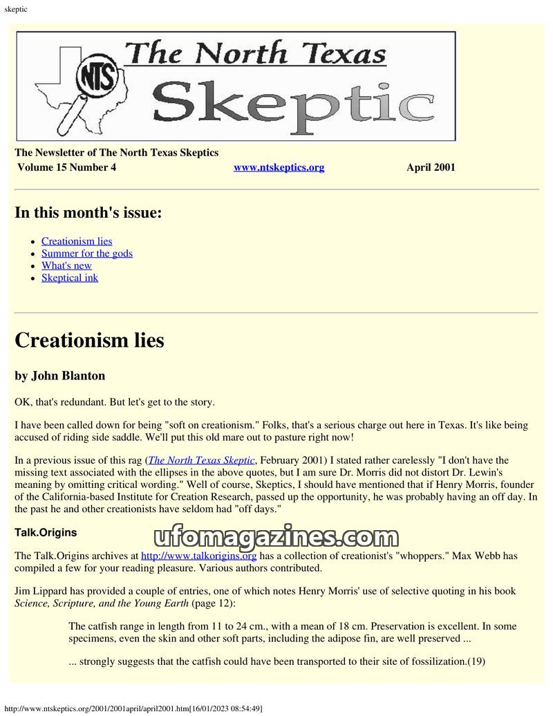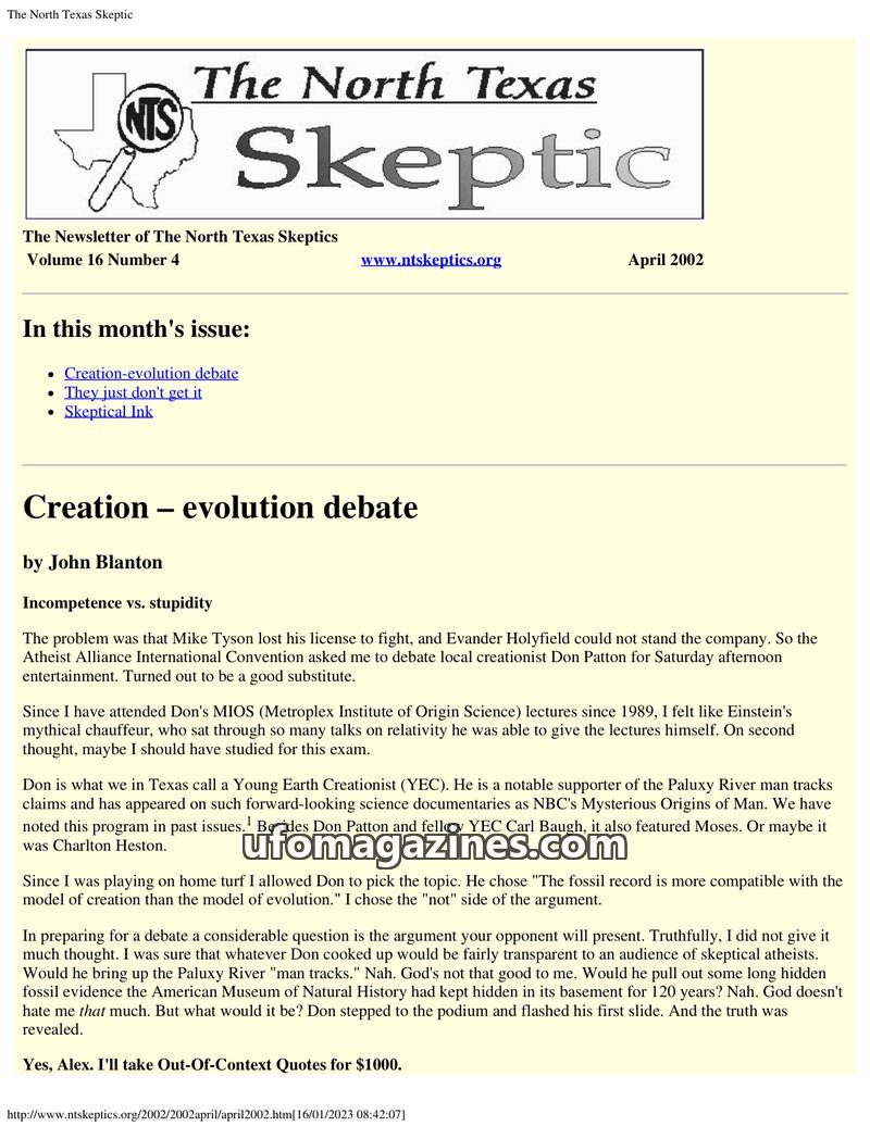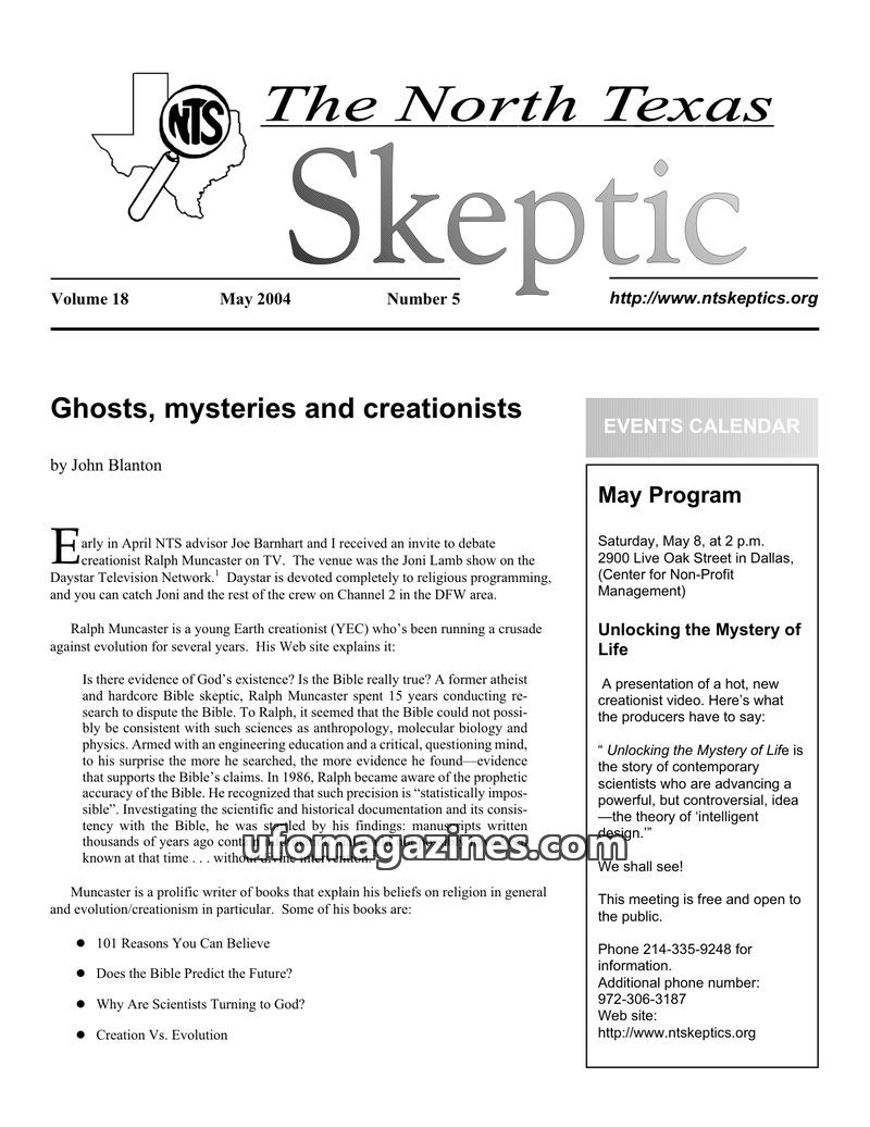 This issue of The North Texas Skeptic covers a debate between NTS advisor Joe Barnhart and creationist Ralph Muncaster on a religious TV program. It also discusses a UFO sighting i