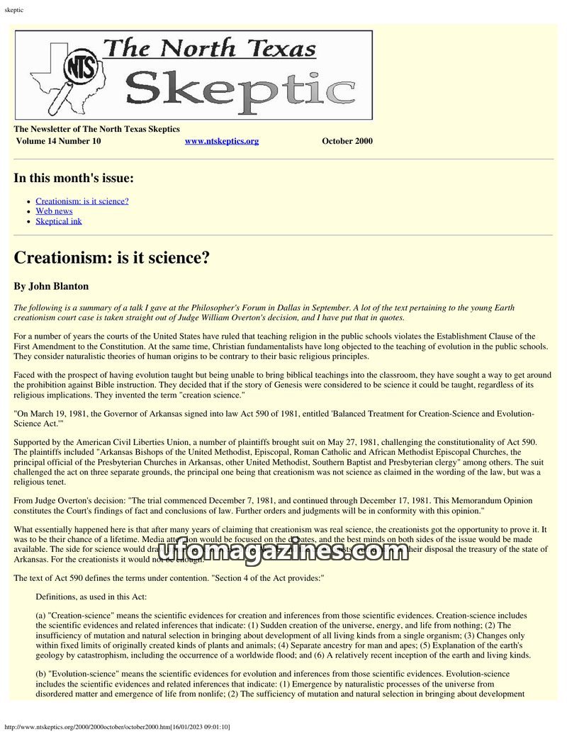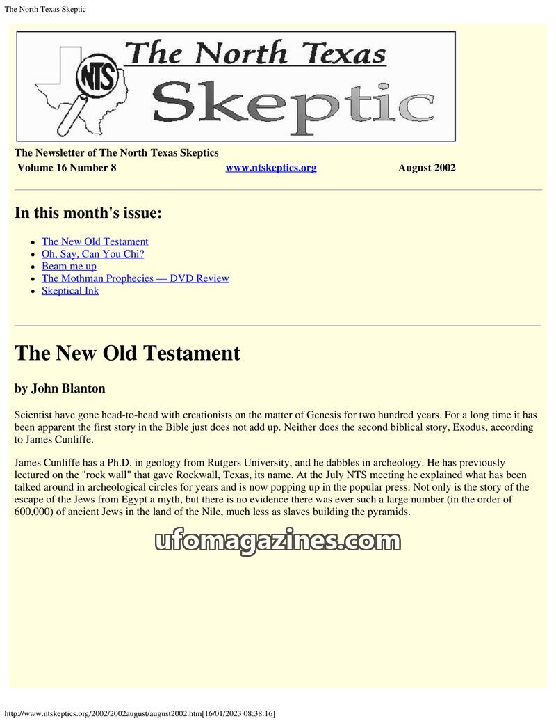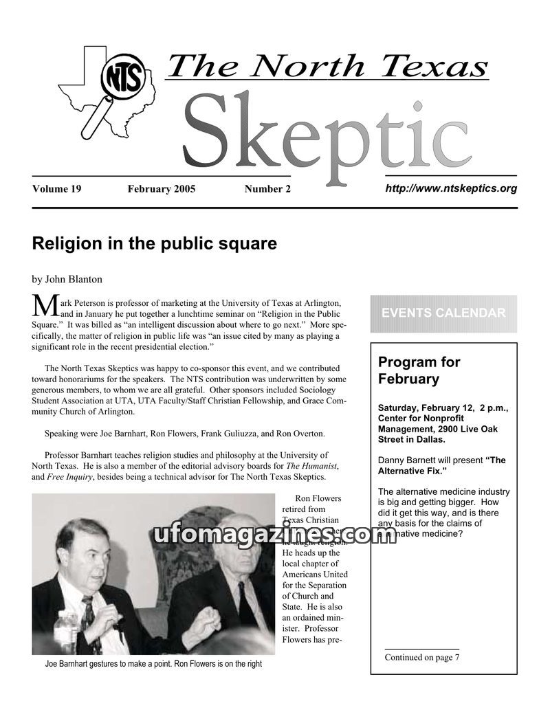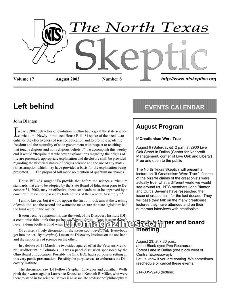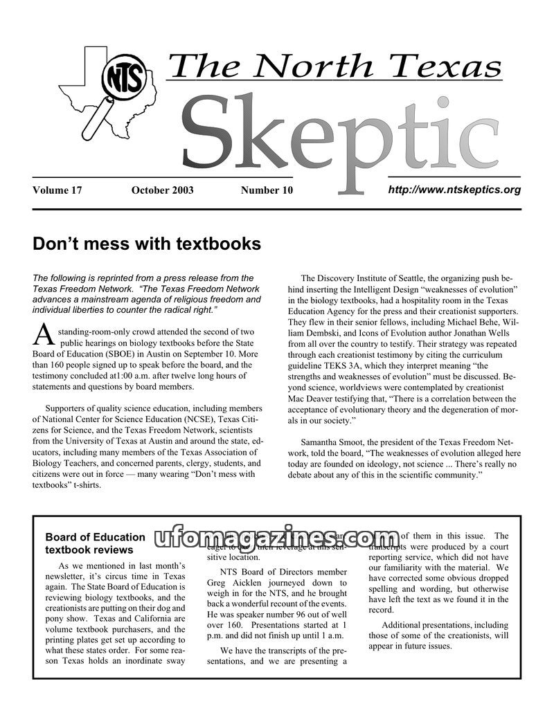 This issue of The North Texas Skeptic covers a debate between NTS advisor Joe Barnhart and creationist Ralph Muncaster on a religious TV program. It also discusses a UFO sighting i