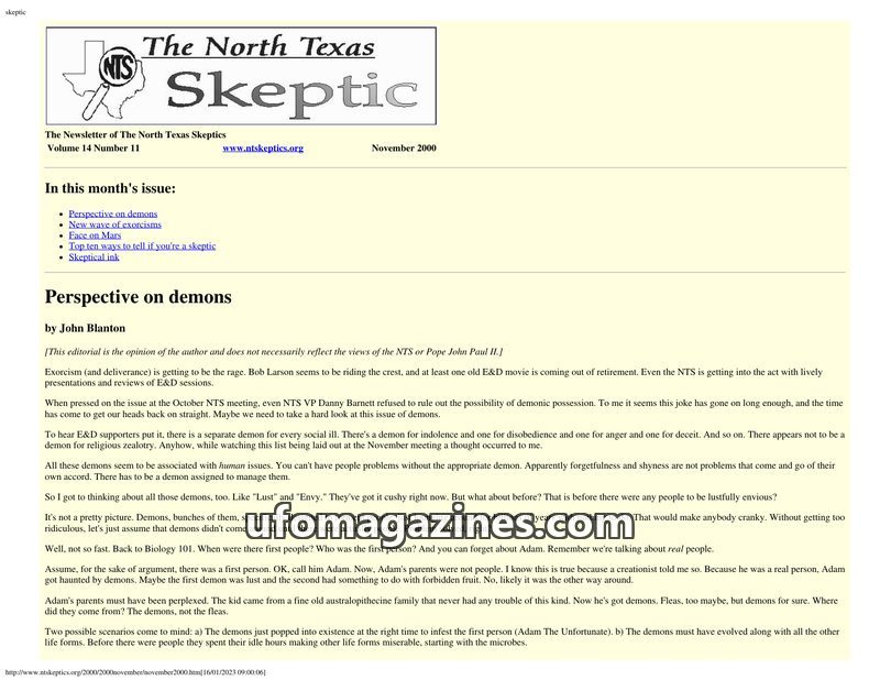 This issue of The North Texas Skeptic explores various topics related to skepticism and debunking. An editorial by John Blanton questions the concept of demons and their origins. A