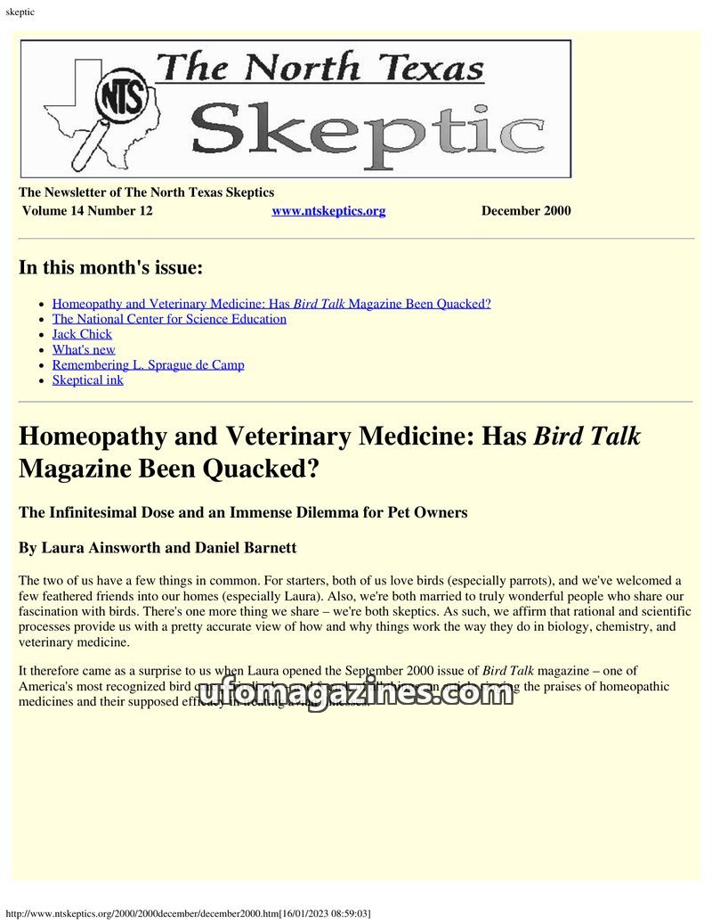 This issue of The North Texas Skeptic critically examines the use of homeopathy in veterinary medicine, questioning its efficacy and the scientific basis presented in a Bird Talk m