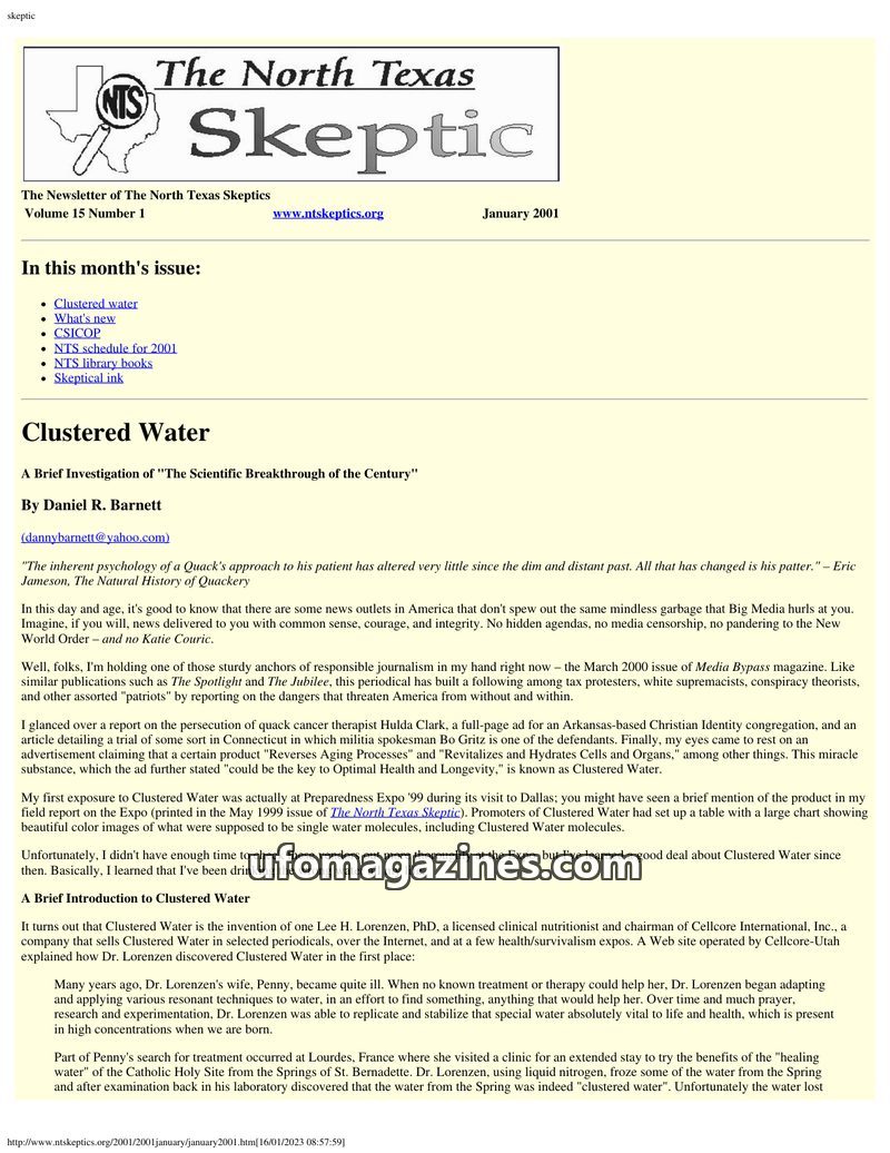This issue of The North Texas Skeptic investigates 'Clustered Water,' a product promoted by Cellcore International, Inc. The article questions the scientific validity of claims mad