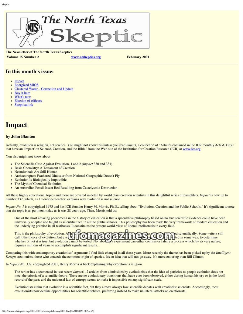 This issue of The North Texas Skeptic critically examines creationist literature, particularly the 'Impact' series from the Institution for Creation Research (ICR), arguing that ev
