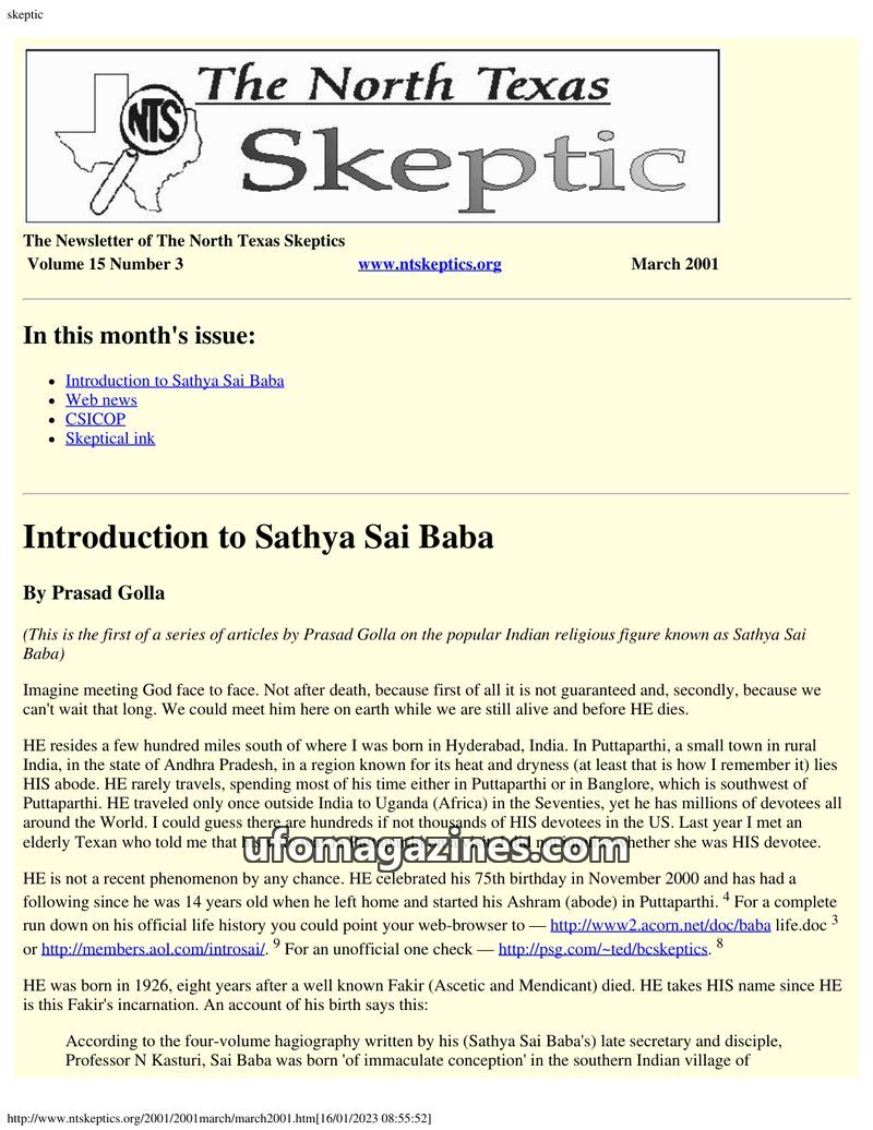 This issue of The North Texas Skeptic features an in-depth look at Sathya Sai Baba, detailing his life, alleged miracles, and the universal religion of LOVE he promotes. It also de