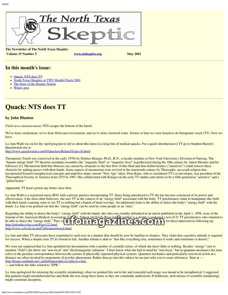 This issue of The North Texas Skeptic critically examines Therapeutic Touch (TT), a practice developed by Dolores Krieger and Dora Kunz, questioning its scientific validity and hig