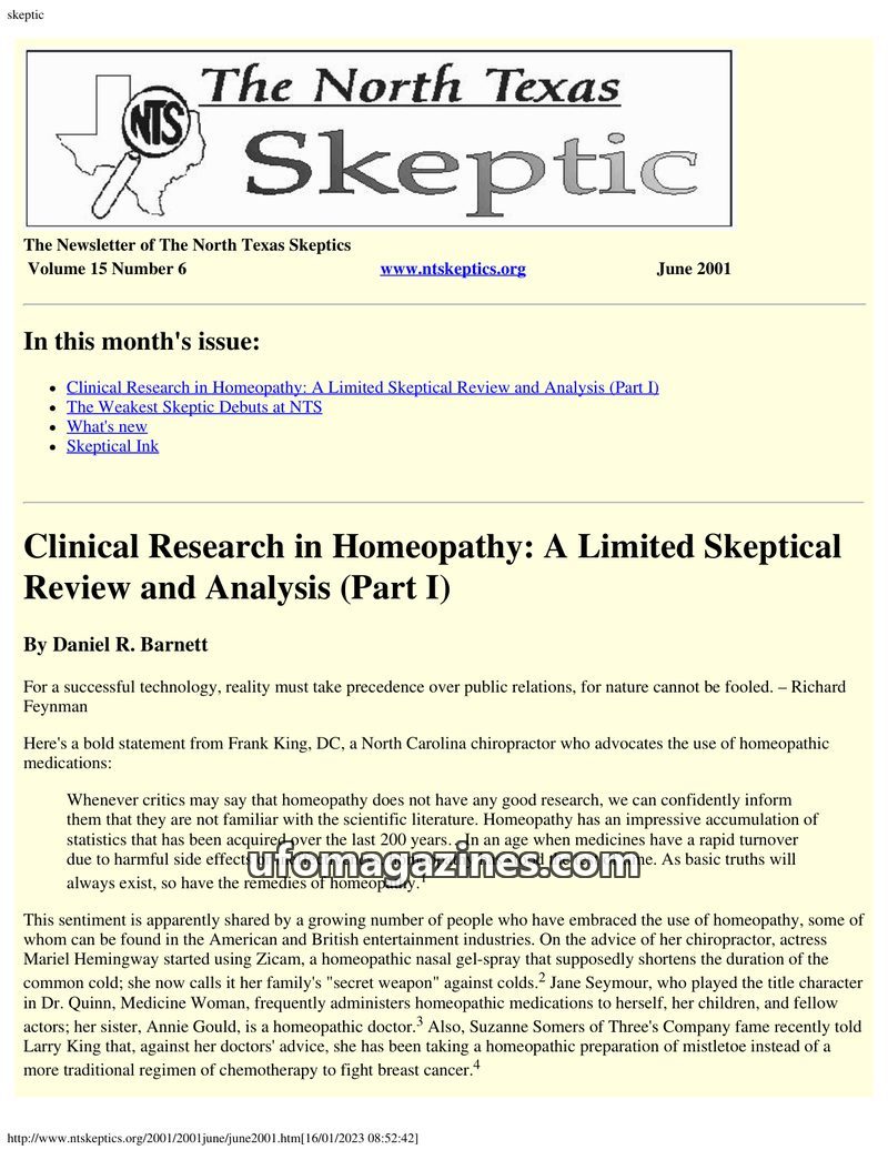 This issue of The North Texas Skeptic critically examines homeopathy, questioning the validity of its clinical research and highlighting the placebo effect as a potential explanati