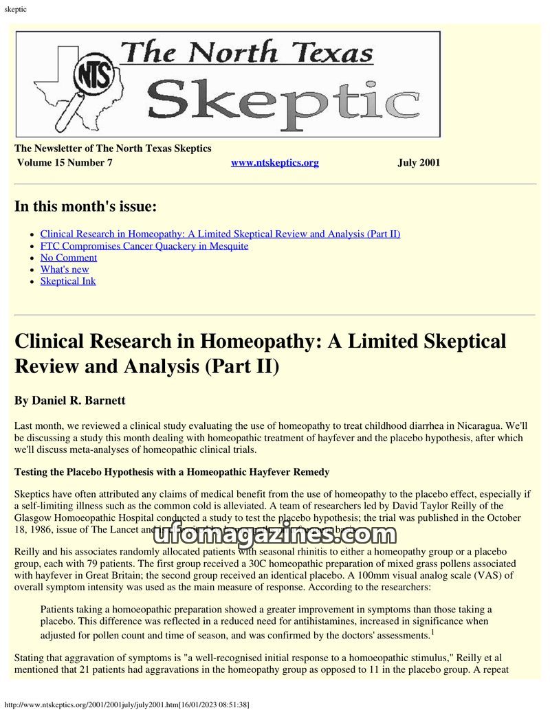 This issue of The North Texas Skeptic critically examines homeopathy, questioning its scientific basis and efficacy through a review of clinical research, particularly a study on c