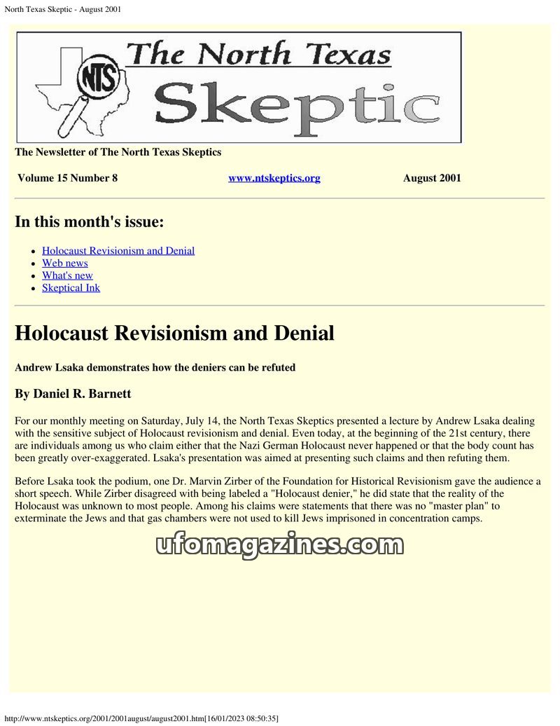 This issue of The North Texas Skeptic features a lecture by Andrew Lsaka refuting Holocaust revisionism and denial, addressing claims about gas chambers and the term 'sonderbehandl