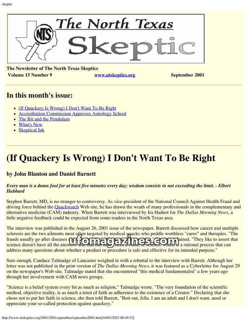 This issue of The North Texas Skeptic features an article critiquing Candace Talmadge's rebuttal to Stephen Barrett's views on health quackery, revealing Talmadge's background in a