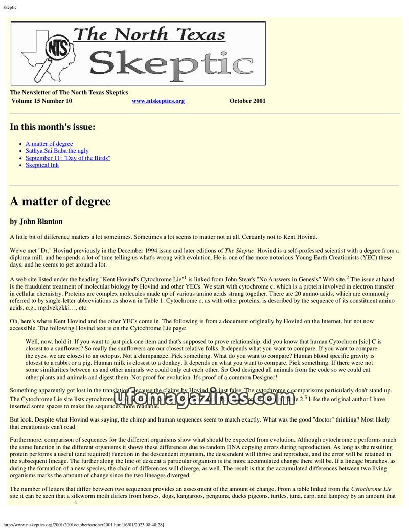 This issue of The North Texas Skeptic critically examines creationist arguments, particularly focusing on Kent Hovind's misrepresentation of cytochrome c sequences to deny evolutio