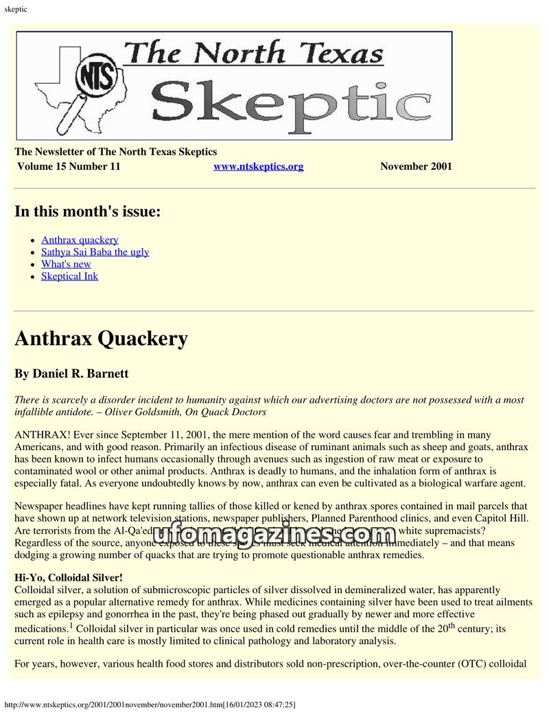This issue of The North Texas Skeptic critically examines various unproven 'cures' and remedies promoted in the wake of the anthrax scare, such as colloidal silver and essential oi