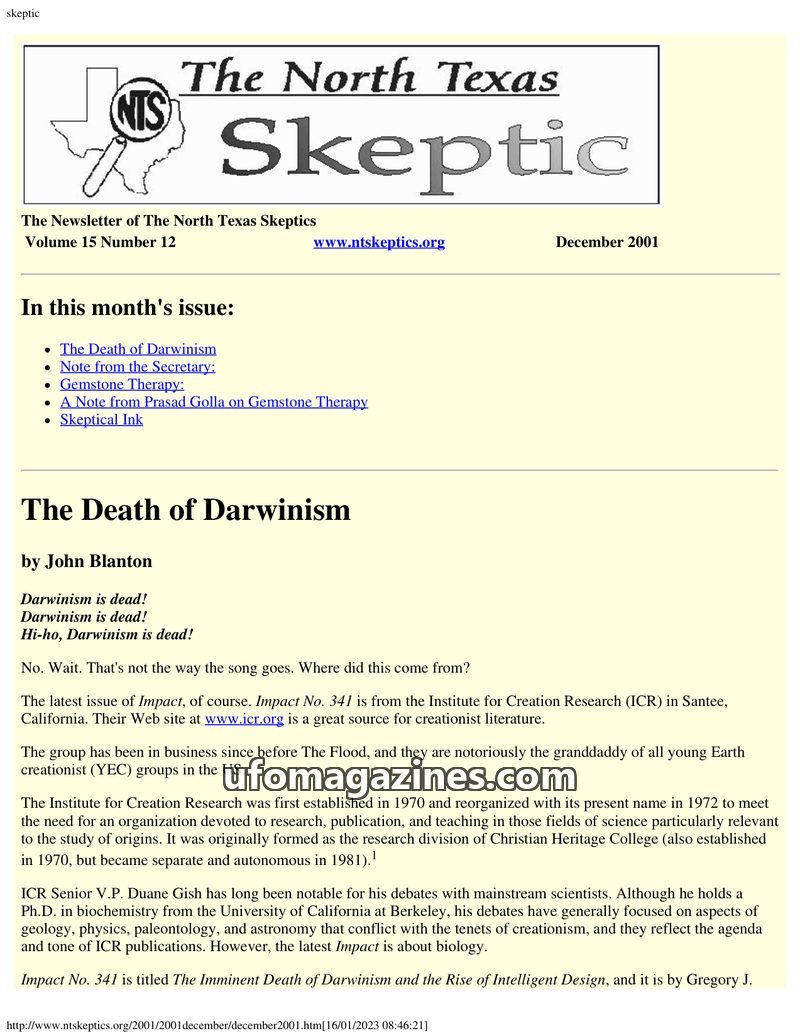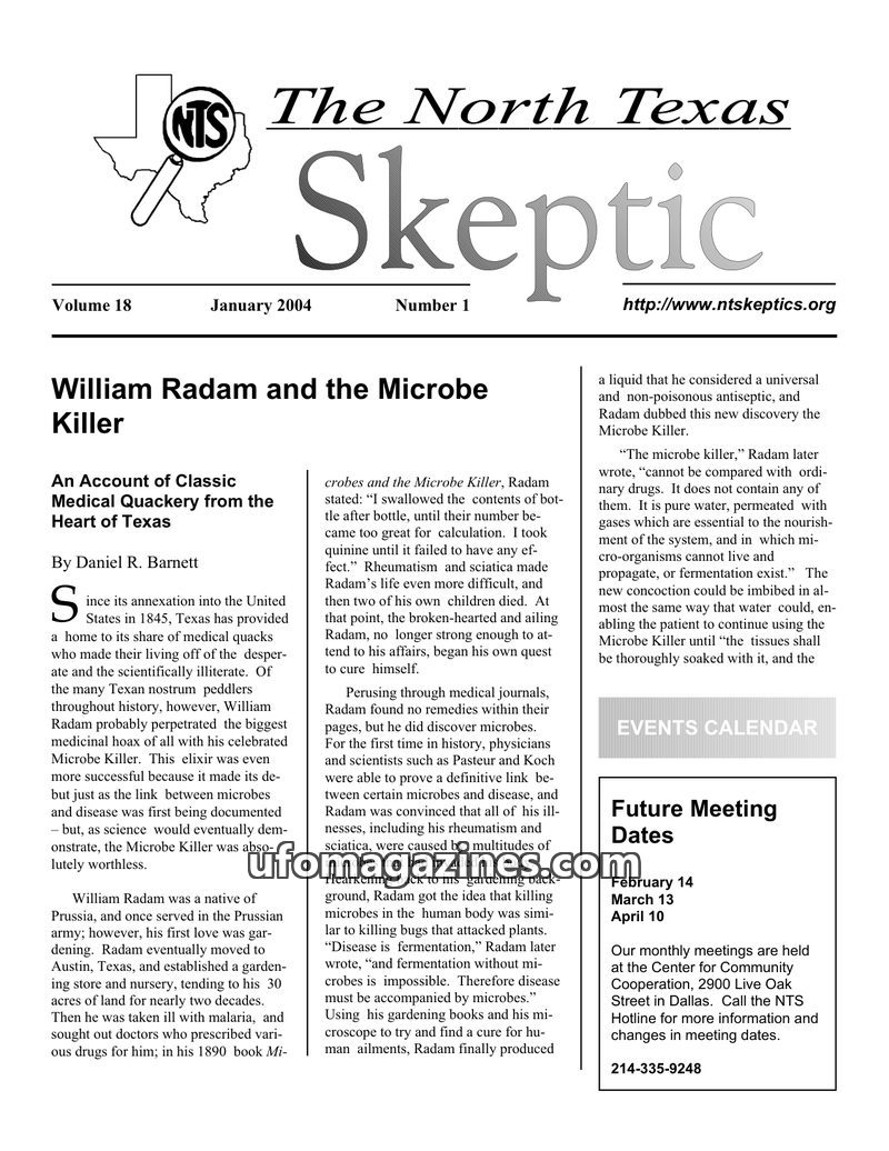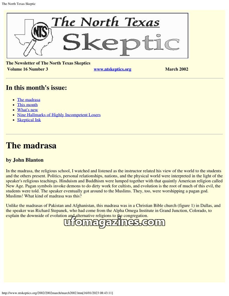 This issue of The North Texas Skeptic covers a variety of skeptical topics. John Blanton reports on a 'madrasa' in Dallas where Richard Stepanek presented arguments against evoluti