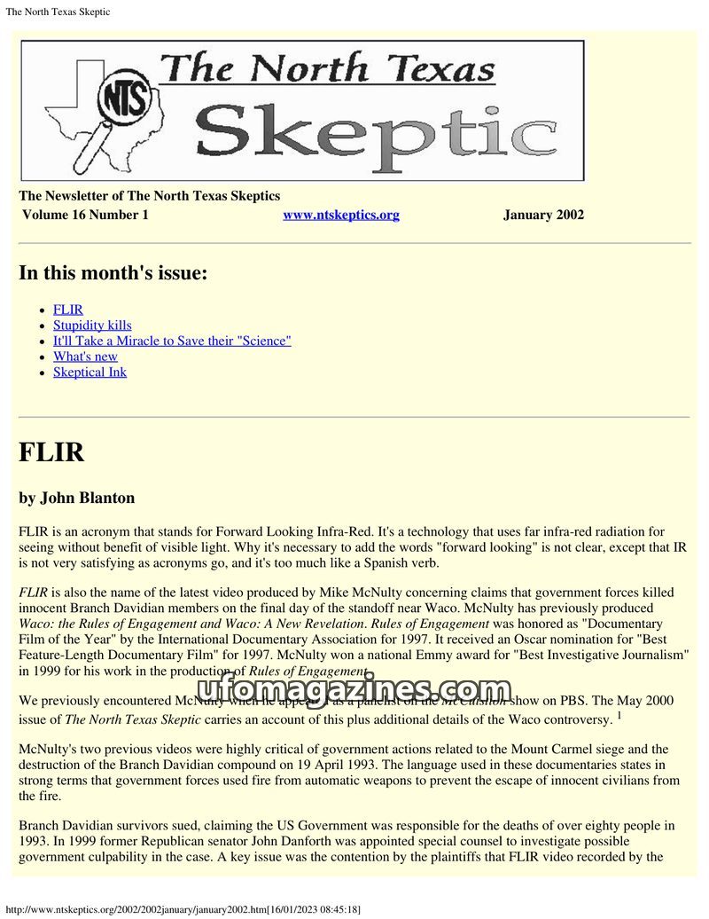 This issue of The North Texas Skeptic features a detailed exchange between John Blanton and Mike McNulty regarding the FLIR video of the Waco incident, debating the interpretation