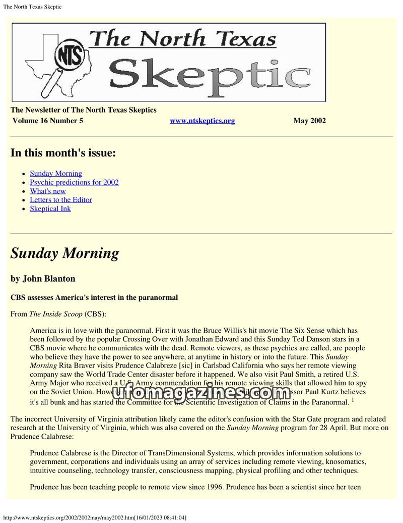 This issue of The North Texas Skeptic features articles on remote viewing, including the Star Gate program and individuals like Prudence Calabrese and Paul Smith. It also presents