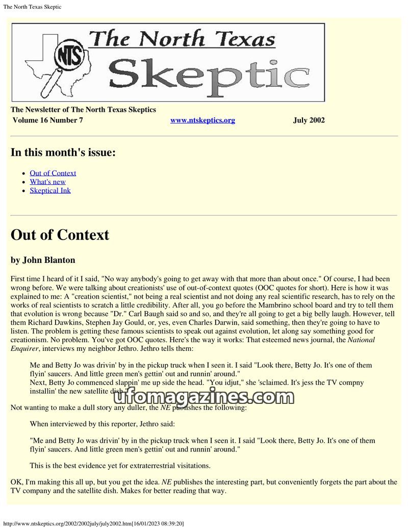 This issue of The North Texas Skeptic focuses on the misuse of out-of-context quotes, particularly by creationists, to support their arguments. The article 'Out of Context' by John