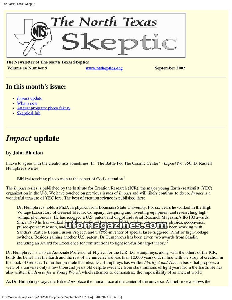 This issue of The North Texas Skeptic critically examines creationist arguments, particularly those of D. Russell Humphreys of the Institute for Creation Research, who claims the u
