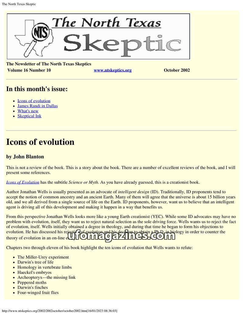 This issue of The North Texas Skeptic critically examines Jonathan Wells' book 'Icons of Evolution,' which challenges evolutionary theory using ten 'icons.' The magazine also repor