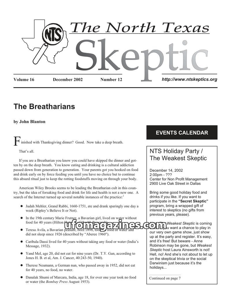 This issue of The North Texas Skeptic features an article by John Blanton titled 'The Breatharians,' which examines the practice of living without food or water. The article posits