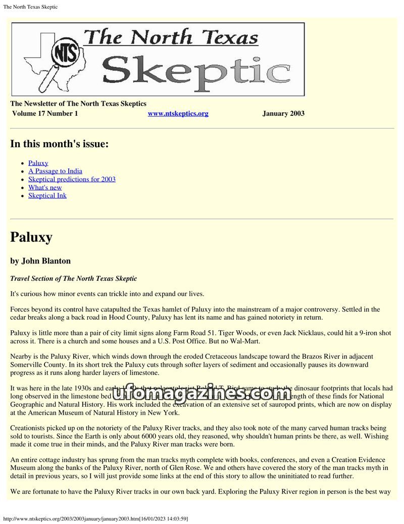 This issue of The North Texas Skeptic delves into the Paluxy River man tracks controversy, detailing how the area became a focal point for creationist claims. It also features a pe