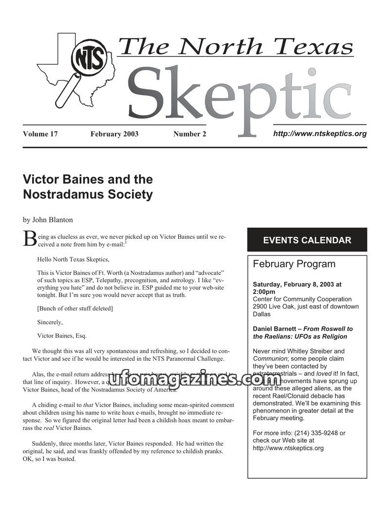 This issue of The North Texas Skeptic, dated February 2003, features an article by John Blanton discussing Victor Baines and the Nostradamus Society, including an examination of su