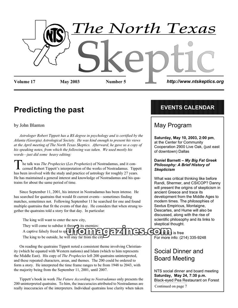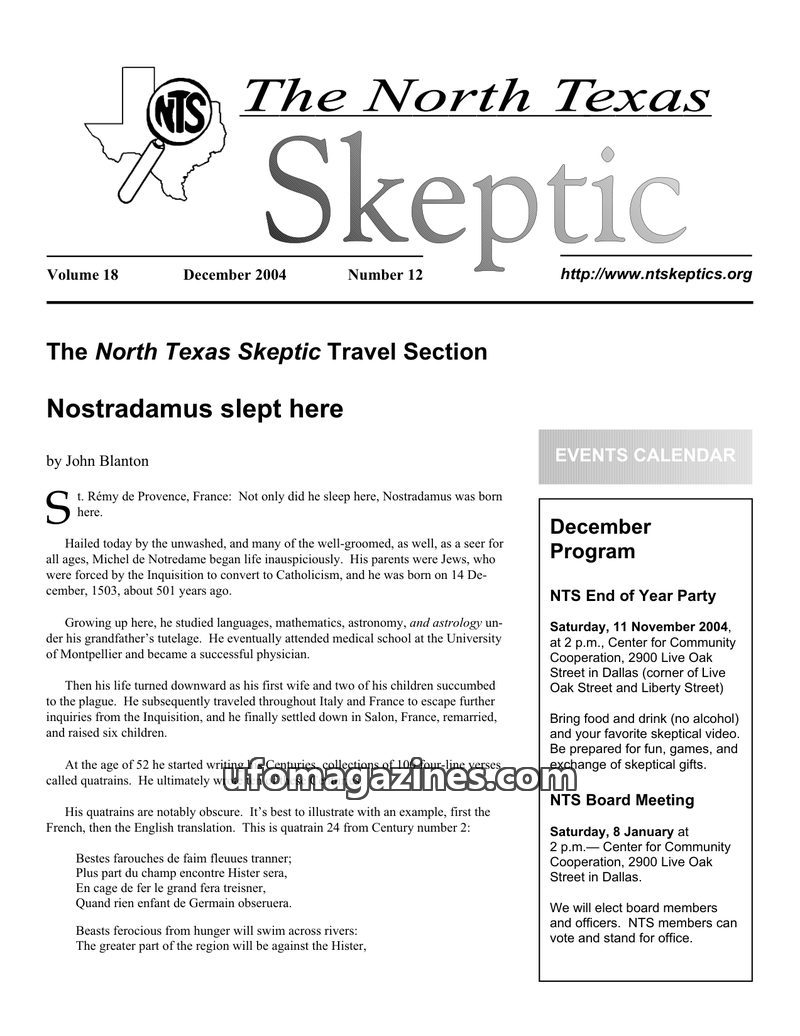 This issue of The North Texas Skeptic features an article by John Blanton analyzing Robert Tippett's interpretation of Nostradamus's prophecies, focusing on quatrains related to cu