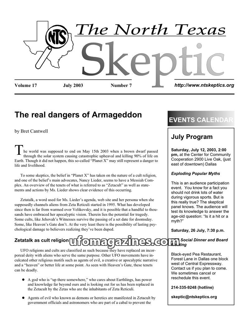 This issue of The North Texas Skeptic focuses on the 'Zetacult' and its leader Nancy Lieder, who predicted the end of the world on May 15, 2003, due to 'Planet X'. The article anal