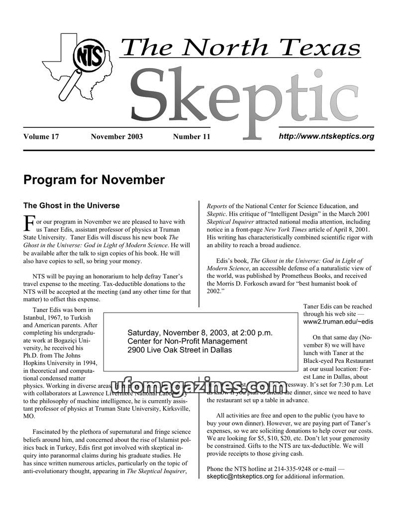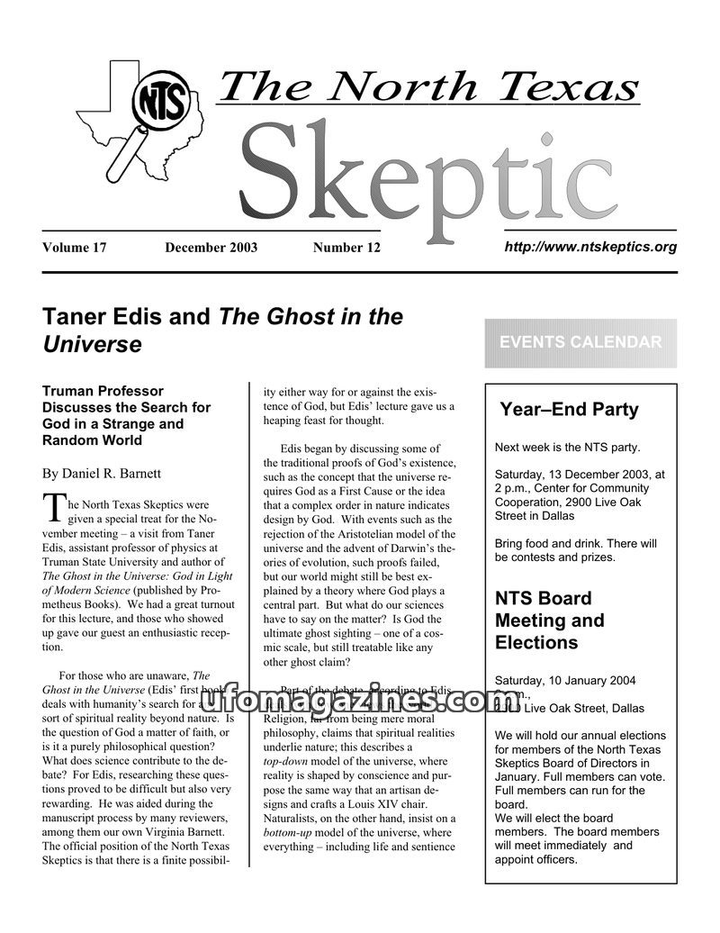 This issue of The North Texas Skeptic features an interview with physicist Taner Edis about his book 'The Ghost in the Universe: God in Light of Modern Science.' It also debunks th