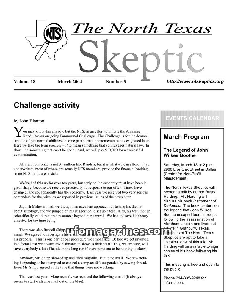 The March 2004 issue of The North Texas Skeptic highlights the organization's ongoing Paranormal Challenge, offering $10,000 for a successful demonstration of paranormal abilities.