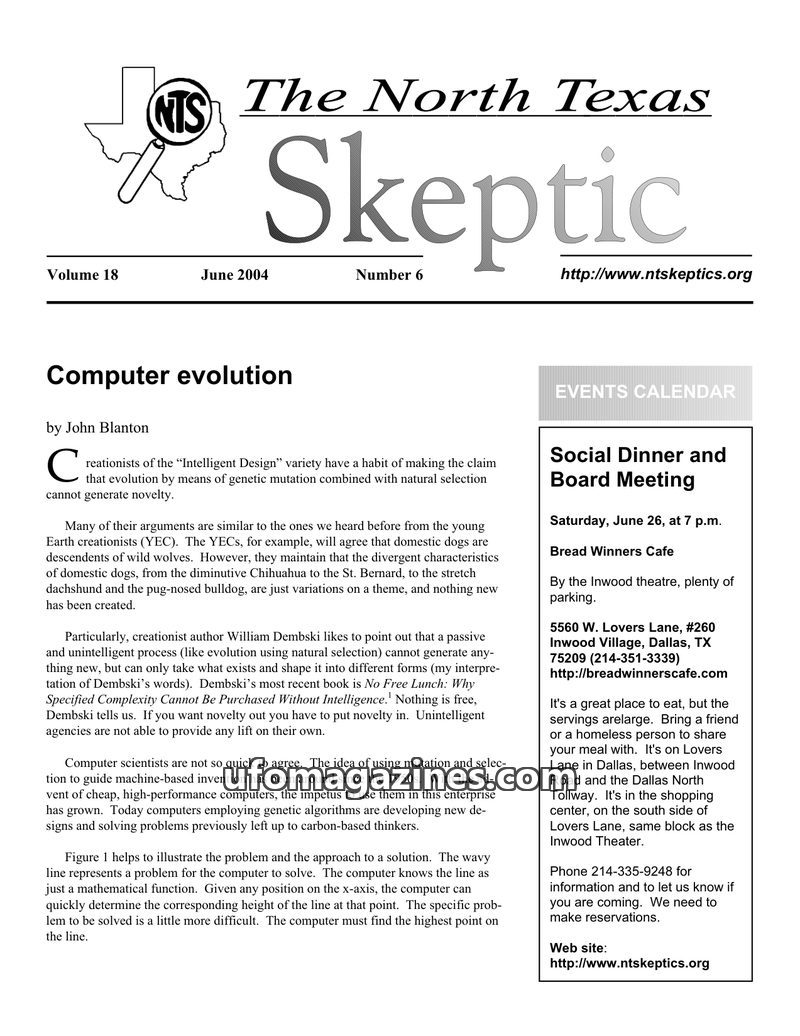 This issue of The North Texas Skeptic explores the concept of 'computer evolution' through genetic algorithms, contrasting it with 'Intelligent Design' arguments. It highlights how