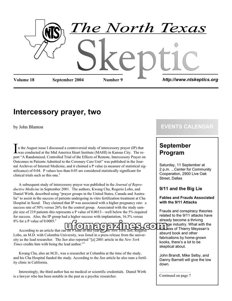 This issue of The North Texas Skeptic critically examines studies on intercessory prayer, questioning their methodology and findings, particularly a study published in the Journal