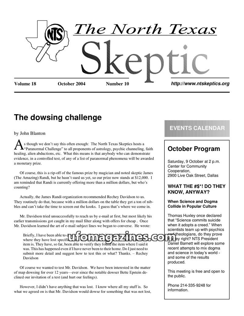The October 2004 issue of The North Texas Skeptic features a 'Paranormal Challenge' with a $12,000 prize for demonstrated paranormal phenomena. The issue details a dowsing test con
