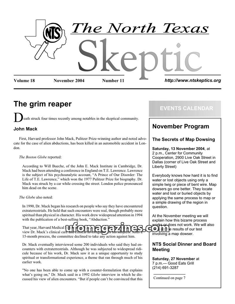 This issue of The North Texas Skeptic reports on the deaths of notable figures in skepticism and related fields, including Harvard professor John Mack and astrologer Joyce Jillson.