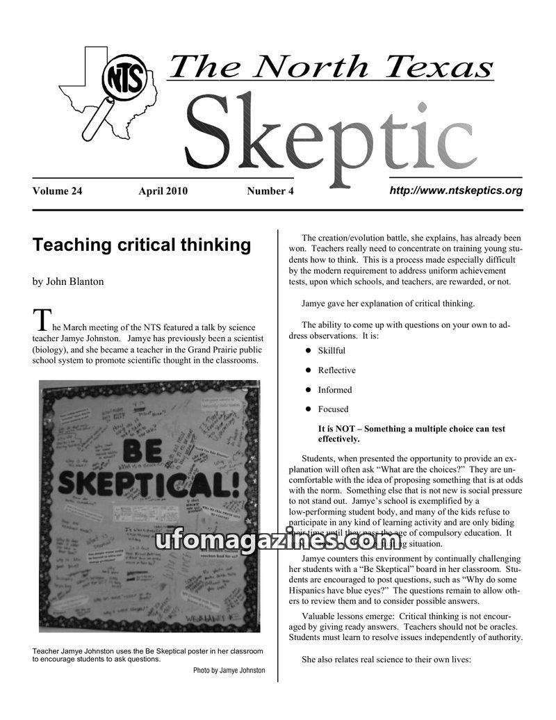 This issue of The North Texas Skeptic focuses on teaching critical thinking in classrooms, with a feature on science teacher Jamye Johnston. It delves into the creationism vs. evol