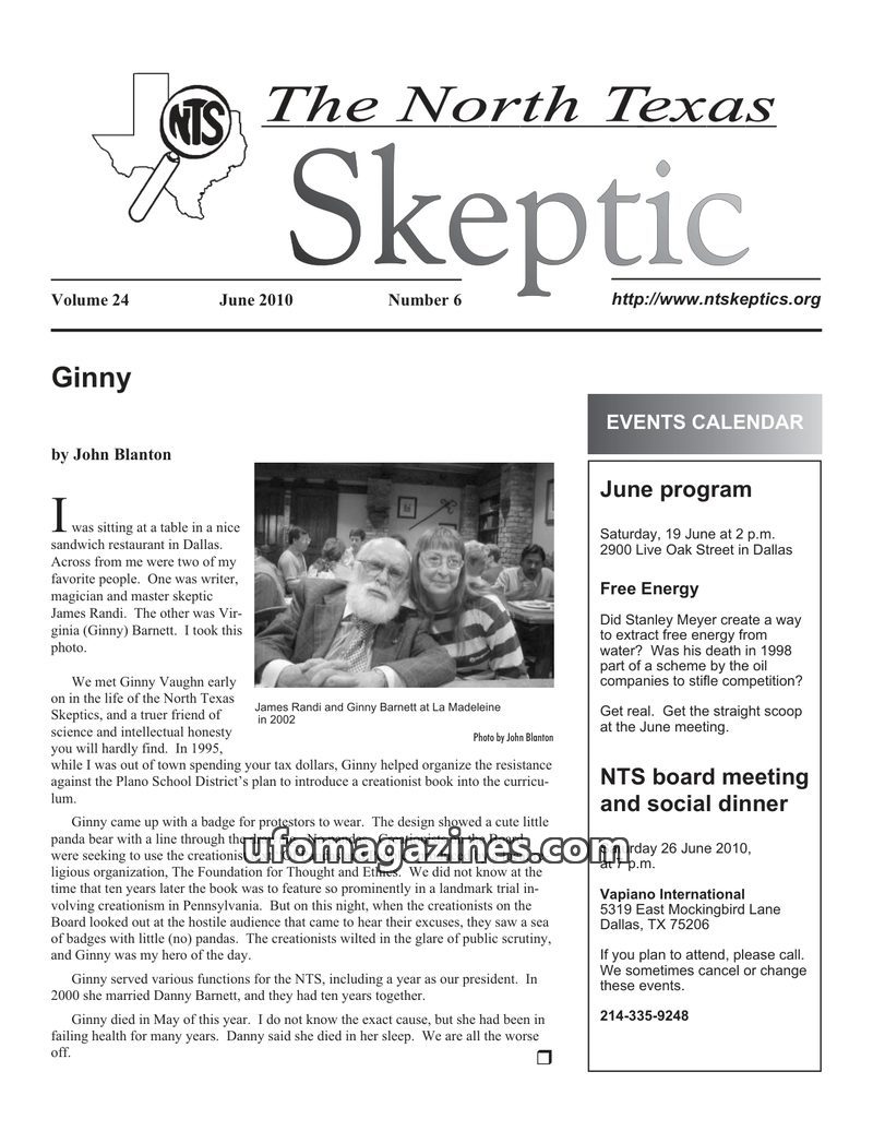 This issue of The North Texas Skeptic features an obituary for Virginia (Ginny) Barnett, a long-time supporter of the organization. The lead article, 'L' Affaire Coppedge,' details