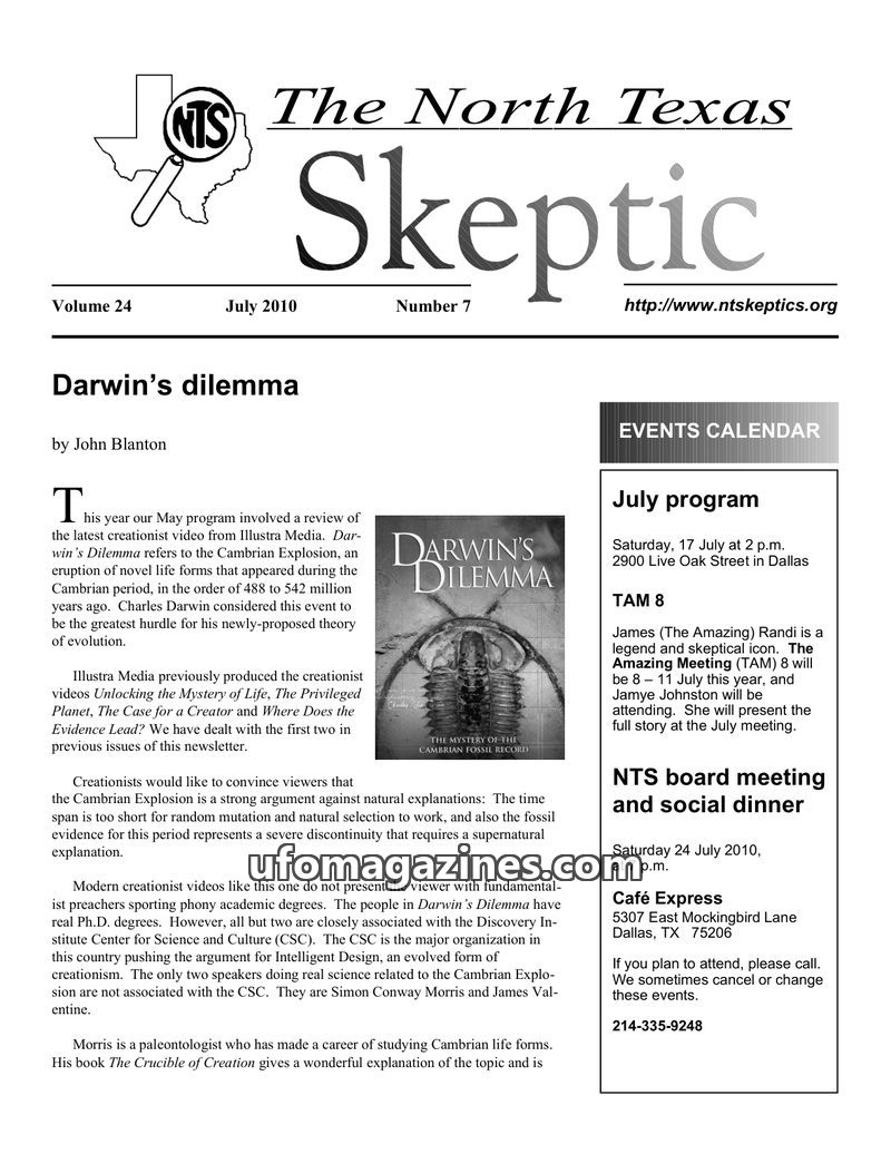 This issue of The North Texas Skeptic focuses on the creationist video 'Darwin's Dilemma' and the scientific debate surrounding the Cambrian Explosion. It critiques the arguments p