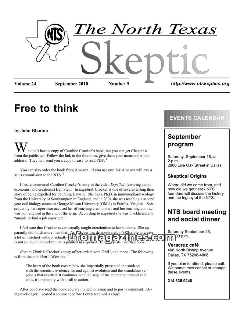 This issue of The North Texas Skeptic focuses on the case of Caroline Crocker, a professor expelled for allegedly teaching creationism. The article "Free to think" by John Blanton