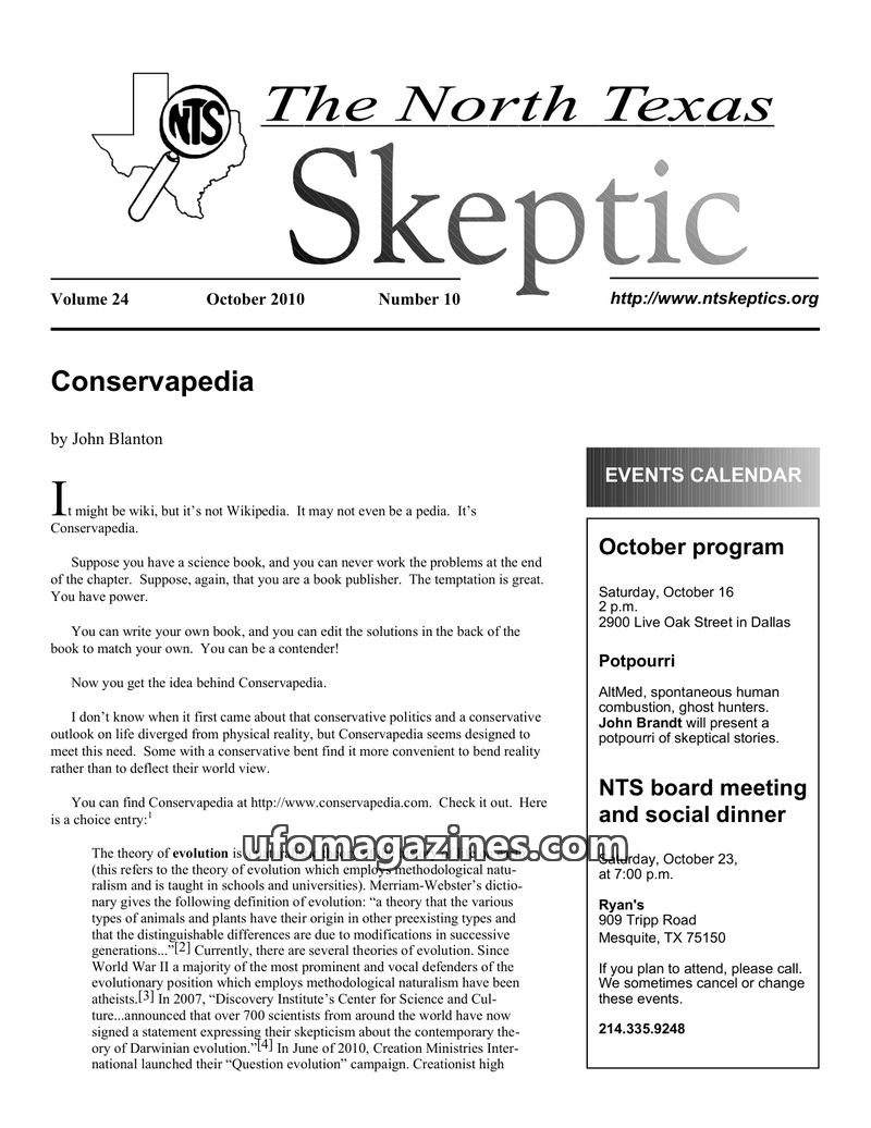 This issue of The North Texas Skeptic critically examines Conservapedia, a wiki project founded by Andy Schlafly, which presents information from a conservative Christian viewpoint