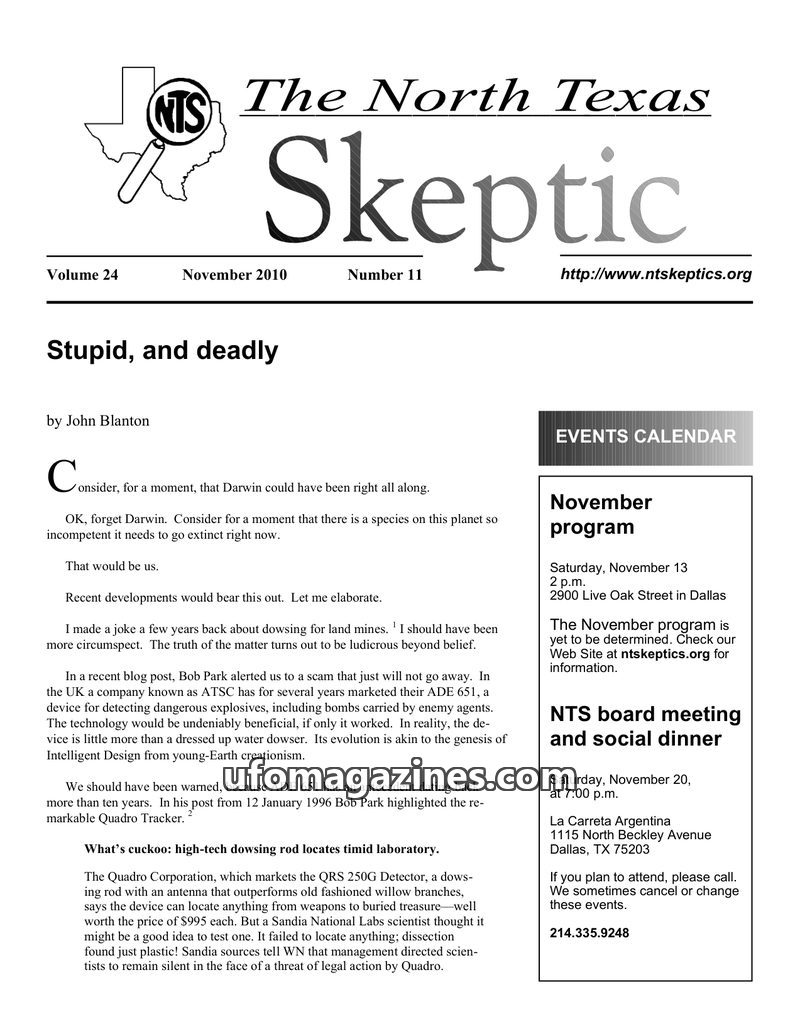 This issue of The North Texas Skeptic critically examines various forms of pseudoscience and fraud. It details how devices like the ADE 651 and Quadro Tracker, marketed as bomb and