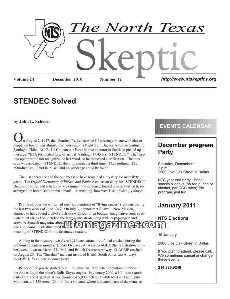 This issue of The North Texas Skeptic delves into the 1947 disappearance of the 'Stardust' aircraft, revealing that the cryptic 'STENDEC' message was likely an attempt to signal 'V