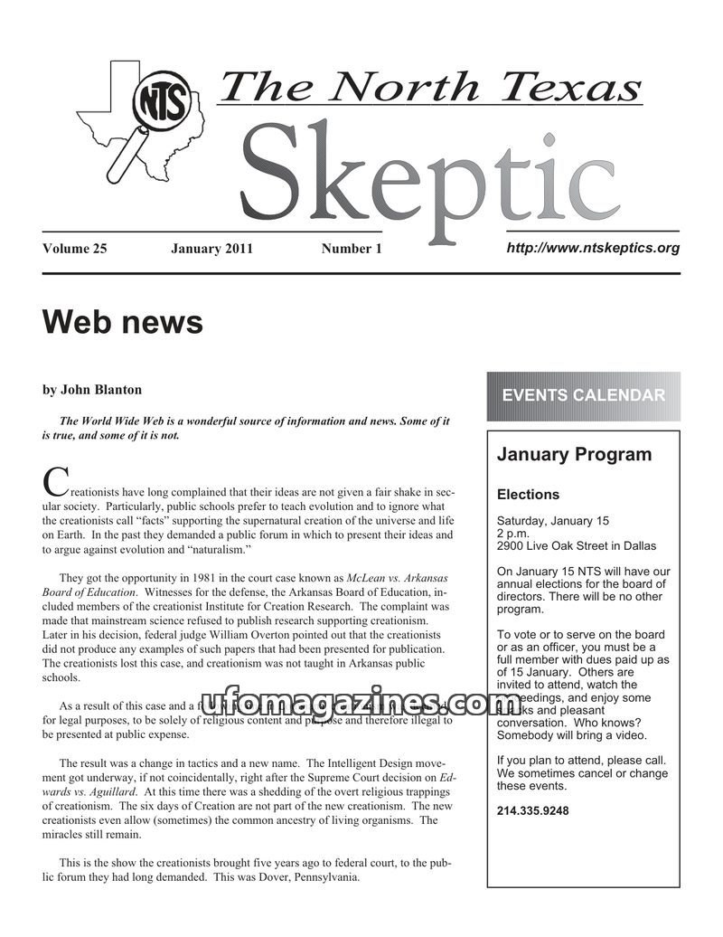 This issue of The North Texas Skeptic covers various topics including the debate over teaching creationism in schools, highlighting an exchange between reporter Jeffrey Weiss and s