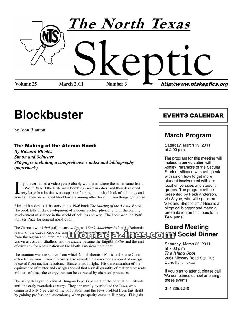 This issue of The North Texas Skeptic features a detailed review of Richard Rhodes' book 'The Making of the Atomic Bomb,' exploring the scientific and historical context of its dev