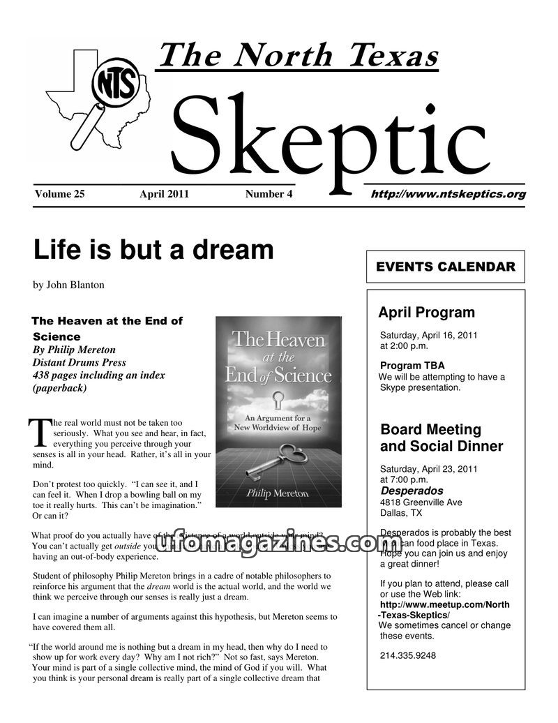 This issue of The North Texas Skeptic explores philosophical and scientific debates. It reviews Philip Mereton's book 'The Heaven at the End of Science,' which argues that the drea